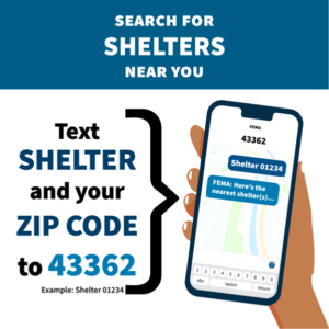 Use FEMA text messaging to find up to three emergency shelters or FEMA Disaster Recovery Centers nearby.